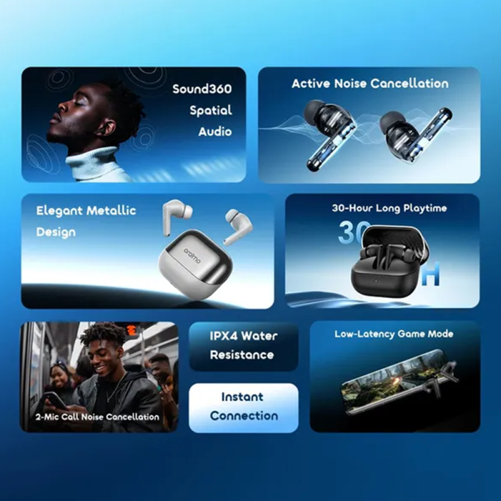 • تقنية Sound360 للصوت المحيطي: توسع نطاق الصوت لتجربة صوتية غامرة شبيهة بالسينما عبر تطبيق Oraimo Sound.
